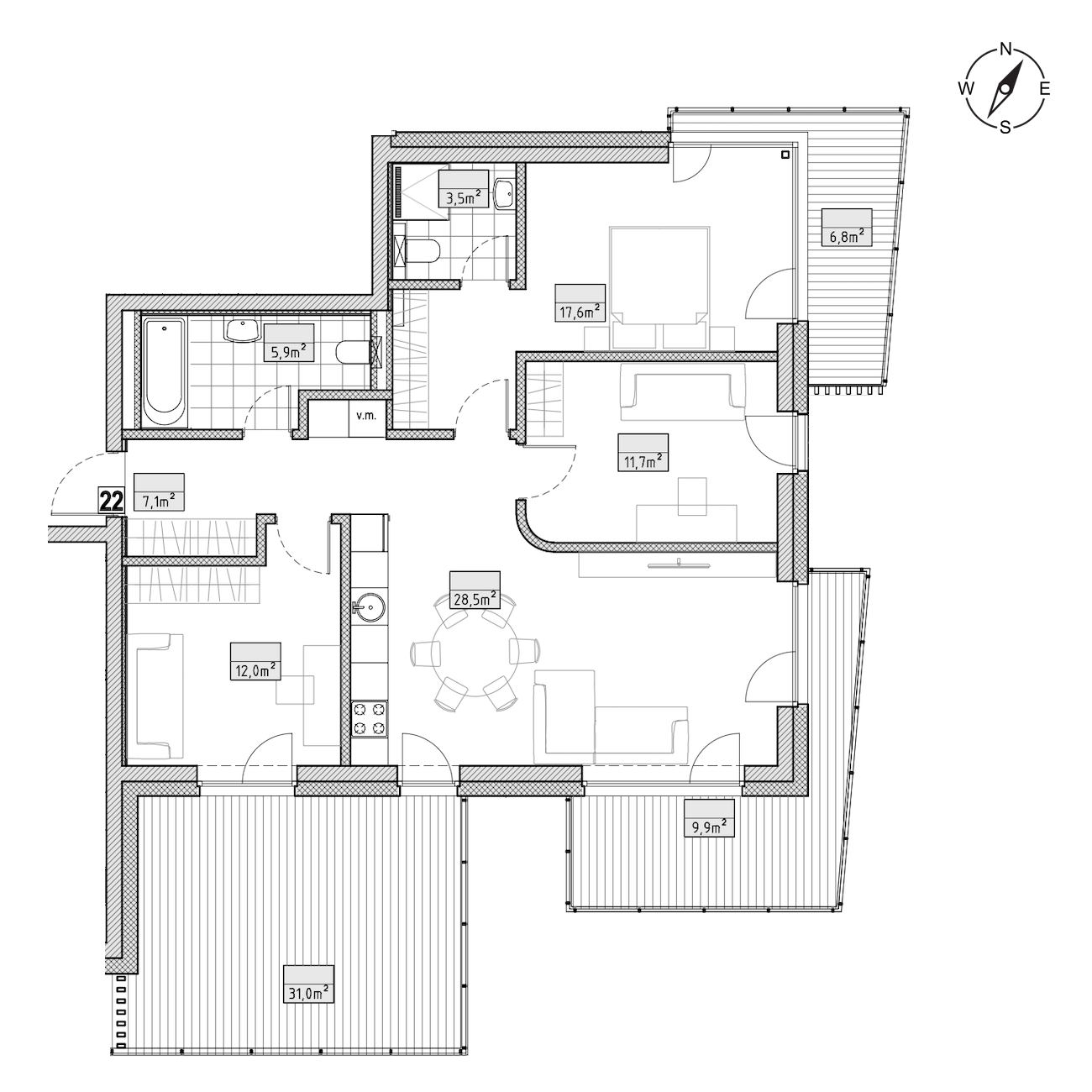 | No. 22 | 4 | 4 | 2 | 134 m2 | 3 200 EUR | 428 800 EUR | Available | Balconies - 2, terrace | Apply |